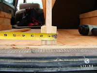 The top sits just above the rear passenger side wheel well. The driver side well sits slightly higher for the fuel filler neck, so I used cardboard to trace the profile of the wheel well. I used the cardboard to transfer the profile to the plywood top. This keeps the drawers as low as possible and still allows for storage boxes to fit snugly across the entire top.Because I wanted to have a full width platform for the rear section, 53", I am using brass cabinet screws to secure the top to the base. This will allow me to remove the top from the vehicle by tilting it at and angle and well it takes some practice.